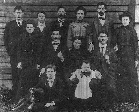 Elizabeth Nelson was the wife of Joseph Allen Dunlap. Back row, left to right: John Dunlap, Henry Dunlap, David Dunlap, Lula Dunlap, William Dunlap and his wife, Joanna Elizabeth Baldwin Dunlap (my grandparents) Mid row, left to right: Sara Dunlap, Sidney Dunlap (husband of Sara), Elizabeth Nelson Dunlap, Robert Dunlap. Front row on left, Frank Dunlap, baby is Floyd Dunlap (son of William and Joanna Dunlap).