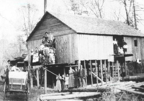 A possible picture made about 1910 of a sawmill owned by Robert Butler. People identified: left on wagon- Monch Smith, right on wagon- Mose Sides, on log 2nd from left- Jodie Butler, 3rd from left- Dovie Butler, 4th from left- Emma Butler Smith, 5th from left- Annie Butler, 6th from left- Bartow Ferrell?, end of building (tall man in front)- Robert Butler. Thanks to Willie Barton for the picture!