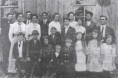 Class photo of Atkins School was made March 2, 1915 and shows Front: Floyd Loveless, Donna McGough, Sallie Davis, Bessie McGough, Richard McGough, Earl Lovelady, Ervin Davis, Dalton Loveless. Back: Maggie Donaldson, Clyde Cook, Julia Cook, Culen Donaldson, Marvin Lovelady, Maude Lovelady, Jim McGough, Henry Cook, Josie Donaldson, Mammie McGough, Susan Donaldson, teacher Mr. Cantrell. Photo courtesy of Mrs. Floyd Loveless and the Northwest Alabamian.