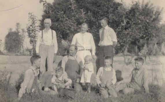Back row: Robert Alexander Hill (father-in-law of Frank Oscar Burdick), Robert Cortez Burdick and J.H. Campbell (husband of Viola Burdick). Sitting: Blaine, Fred, Frank Oscar, Harold, Isadore and Burton Burdick. (thanks to Sallie Cox)