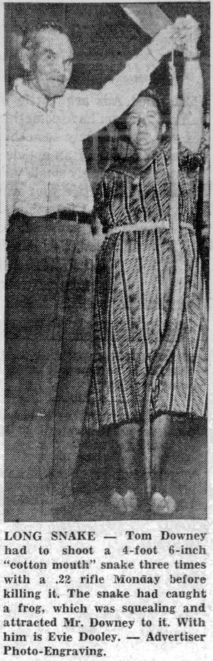 Paul Downey submitted this newspaper article of his great-grandfather John Thomas Downey, who went by Tom Downey. It is from the Advertiser, 8/13/1958.