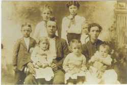 James Anderson Wilson (b. July 1871) with wife Martha Eveline League Wilson (b. February 1871) and children (left to right, back row) James Dewey Wilson (b. May 1900), Samantha E. Wilson (b. October 1895), Mary L. Wilson (b. June 1893) and Nora E. Wilson (b. March 1898); (left to right, front row) Birdie C. Wilson (b. about 1905 - sitting on James Anderson Wilson's lap), Emma E. Wilson (b. about 1902 - standing between father and mother) and baby Pearl E. Wilson (b. 1907 - sitting on Martha Eveline League Wilson's lap).