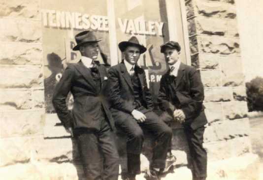 The Tennessee Valley Bank (most likely Double Springs) about 1920. Standing in front are, left to right, Dewey Hobson Mitchell, Milton Carroll Mitchell, Jr., and either Basil P. Mitchell or Virgil Greene. Courtesy of Dana (Mitchell) Womack.