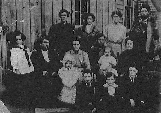 Mid-row, left to right: Pansy Dunlap, Lewis Baldwin, Hulda Ann Rivers Baldwin, Will Dunlap holding Violet Dunlap, and Joanna Elizabeth Baldwin Dunlap.