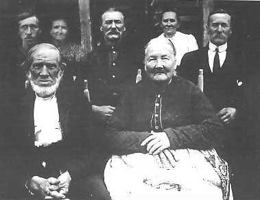 Frederick Hicks Baughn (82 yrs.) and wife Margaret Holt-Baughn (80 yrs.). Foreground is two females could be daughters Sara and Frances Baughn. The three men (left to right) are: Joseph Herbert, William Jasper, and George Peyton Baughn, sons of Frederick and Margaret. Three other children not in photo: Martha Baughn-Mobley, Nancy Baughn-Cagle, and Frederick Jackson Baughn (died 1901).