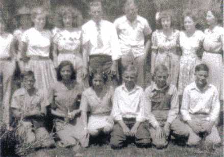 Top row, left to right: ?, ?, Doris Jones, Ethel Lee Lyle, Neal Glover, ?, Faye Jones, Vernice Collins (married Winford Watts), and Minnie Jones.