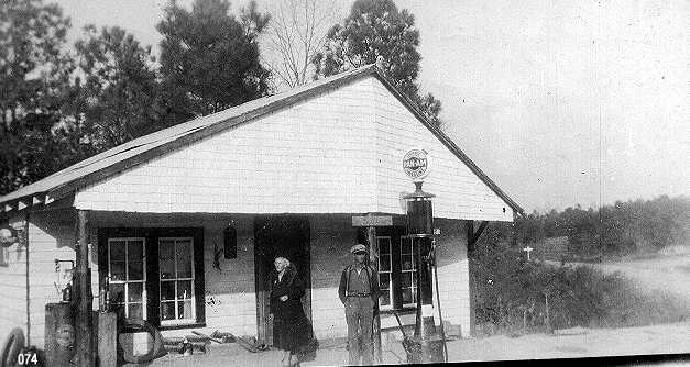 The subject of this picture is a store which use to be on the North side of the intersection of Highway 278 and County Road 63. County Road 63 South goes to Houston. The road in the right of the picture is Highway 278 looking in the direction of Brushy Creek. The lady is Missouri H. Hunter, and the man is Frank Hunter. This was the first store run by Bryan and Myrtie Alford Hunter. Later, their son, John O. Hunter had a store on the South side of the 278 for many years. His wife, Betty Sue, ran a beauty shop next door. Adjacent to the property was the Alford Lumber Company operated by Owen Alford. Photo is from the late 1930s or early 1940s and courtesy of Robin Sterling.