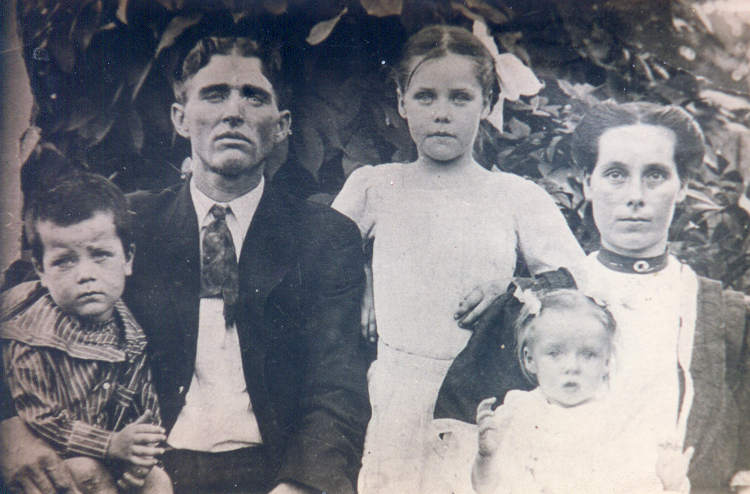 "Left to right in the picture are James Marvin Tidwell who was killed in the 1974 tornado. William Alford "Billy" Tidwell, the girl standing in the picture is my grandmother, Evie Madalene Tidwell Gray, Luella Arkedelphia Garrison Tidwell (known as Delphia) and the child sitting in her lap is Gertrude Tidwell. All are buried in Winston County except my grandmother who is buried in Tennessee."