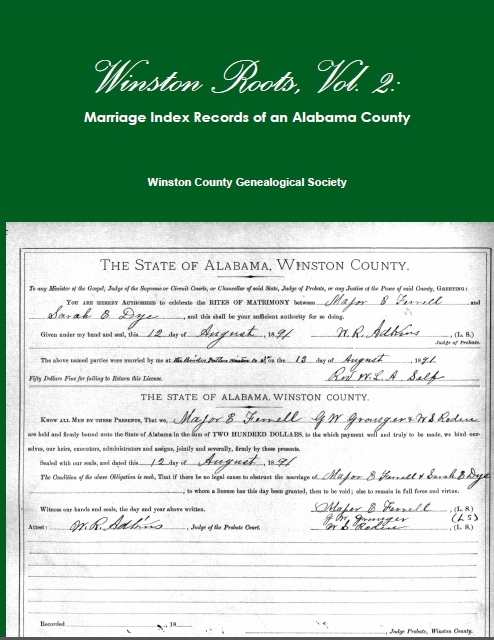Winston Roots, Vol. 2: Marriage Index Records of an Alabama County, by the Winston County Genealogical Society.